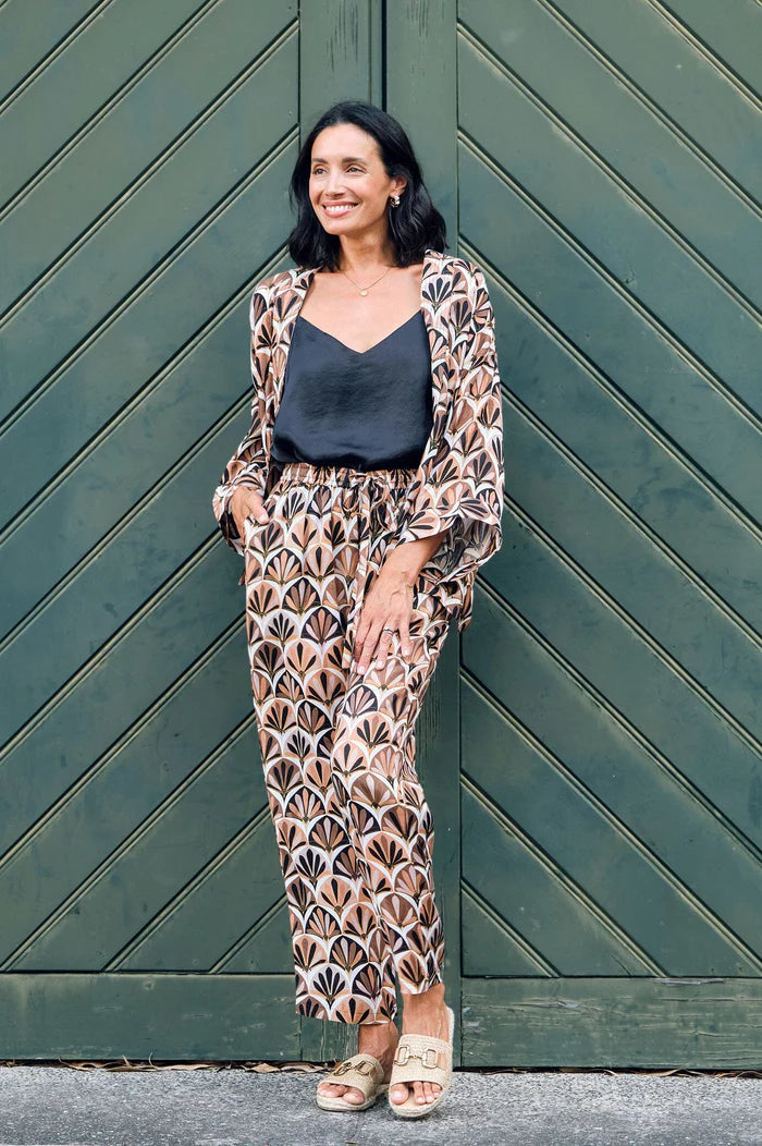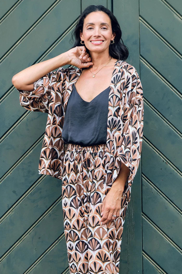 Carolina Nina Cape Mocha features an eye-catching symmetrical fan print.