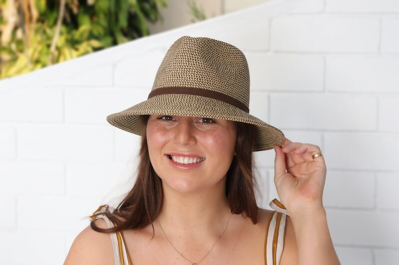 Lulu - Down Brim, Mix Choc is a classic smart casual panama hat perfect for any season in gorgeous warm colours. Mixed chocolate, taupe and black through the weave means you can wear this hat with many colours. Looks great on all white and black linen outfits. Downturned brim in a Panama style. Crafted from 100 percent paper braid keeping it light weight and comfortable to wear. Finished with a suede trim tied in a bow. Great for travelling. Fully adjustable for the perfect fit.