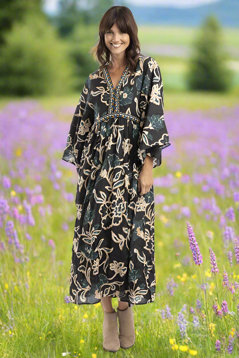 Step into easy elegance with this stunning Orientique Cusco Dress in blue-green floral colour. Crafted from soft, breathable rayon, it features delicate embroidery that flows from the neckline to the waist, adding a touch of artisanal charm. The full-length silhouette is complemented by wide frill sleeves that move beautifully with you, creating an effortlessly graceful look. Designed for both special moments and relaxed daytime gatherings, its serene floral hues bring a sense of calm sophistication. Available in sizes 8 to 16. Made from 100% rayon.