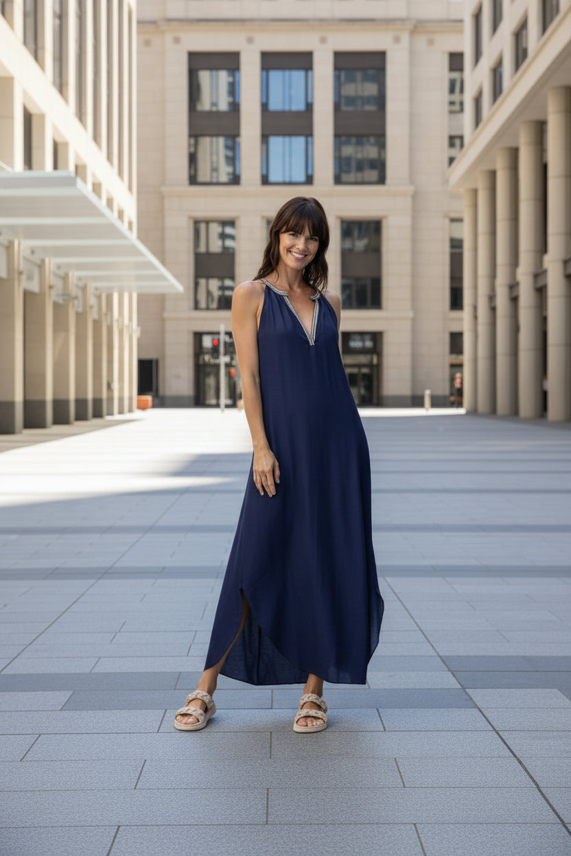 Discover understated luxury with the Orientique Lux Dress, a sleeveless navy maxi that exudes refined sophistication. This elegant piece features a graceful, flowing silhouette that skims the body beautifully, creating an effortlessly chic appearance suitable for any occasion. The timeless navy shade pairs with virtually everything in your closet, while the sleeveless cut ensures breathability and comfort. Whether you're dressing up for an evening event or keeping it casual for weekend wear, this versatile maxi delivers the polished, put-together look you've been searching for. An investment in timeless style that you'll reach for again and again.