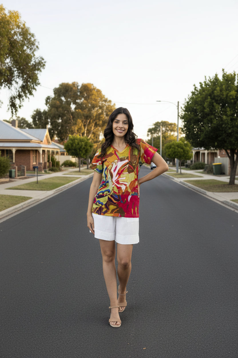 Meet your new go-to basic! This Orientique V-cut tee in gorgeous leaves red is the kind of piece that works harder than it looks. Slip it on solo for instant polish, or layer it under your favourite pieces for endless outfit possibilities. The flattering V-neckline keeps things interesting while the relaxed fit keeps you comfy all day long. Simple, stylish, and seriously versatile—what's not to love?
