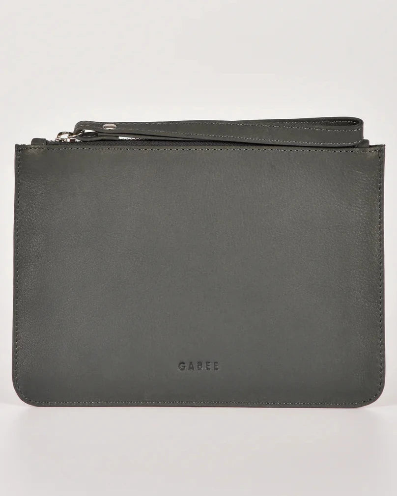 Handmade from soft, buttery leather, it features silver-tone hardware, a top zip closure with a fixed wristlet, and a fully lined interior with Gabee's signature stripe detail and logo plate.