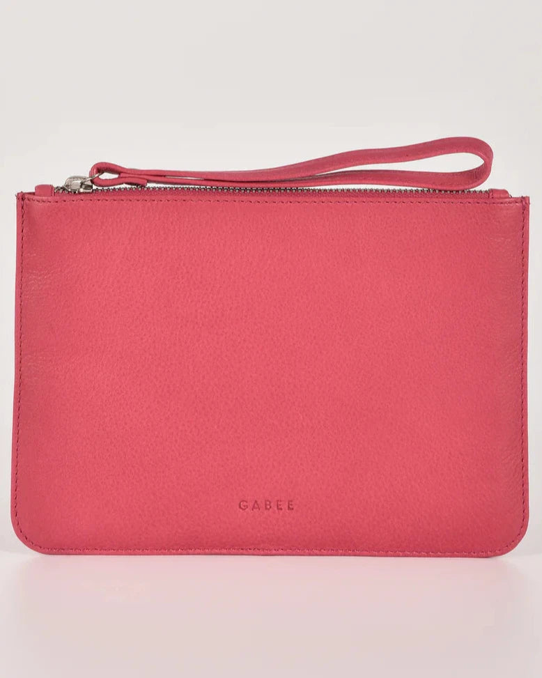 Handcrafted from soft, buttery leather, this pouch features silver-tone hardware, a top zip closure, and a fully lined interior adorned with Gabee’s signature stripe detail and logo plate.