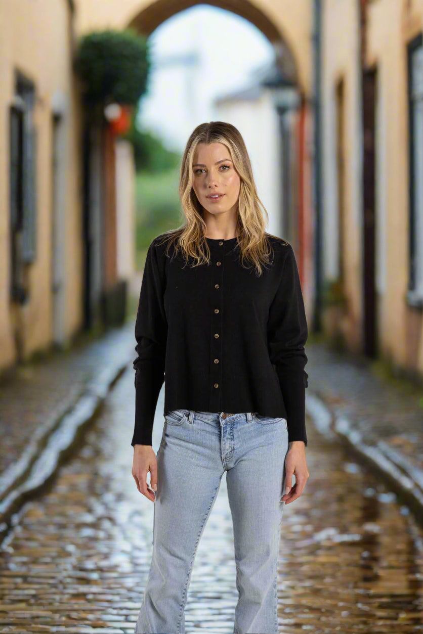 Experience warmth and sophistication with Two T's Cropped Cardigan Black, crafted from extra fine merino wool and cotton. This soft knitwear piece is perfect for adding a touch of style to any outfit, featuring long sleeves and a button through detail for easy layering. Versatile and chic, it's the ideal choice for any occasion. Round neck, long sleeves.
