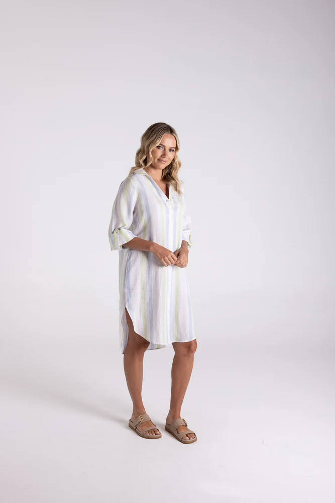 The Two-T's Multi Stripe Linen Shirt Dress combines timeless style with breathable comfort. Crafted from lightweight linen, this dress features a flattering shirt silhouette adorned with vibrant multi-coloured stripes, perfect for warm weather or casual occasions. Its relaxed fit ensures ease of movement while maintaining a polished look, making it an ideal addition to any wardrobe seeking effortless elegance and everyday versatility.
