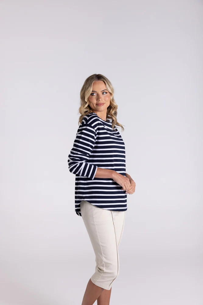 This Two-T’s Stripe Boat Neck 7/8 Sleeve top in Navy and White offers a comfortable, flattering fit perfect for everyday wear. Its classic striped design and boat neckline add a timeless touch, while the 7/8 sleeves provide just the right coverage for versatile styling. Ideal for layering or wearing alone, this piece brings effortless style and comfort to your wardrobe.