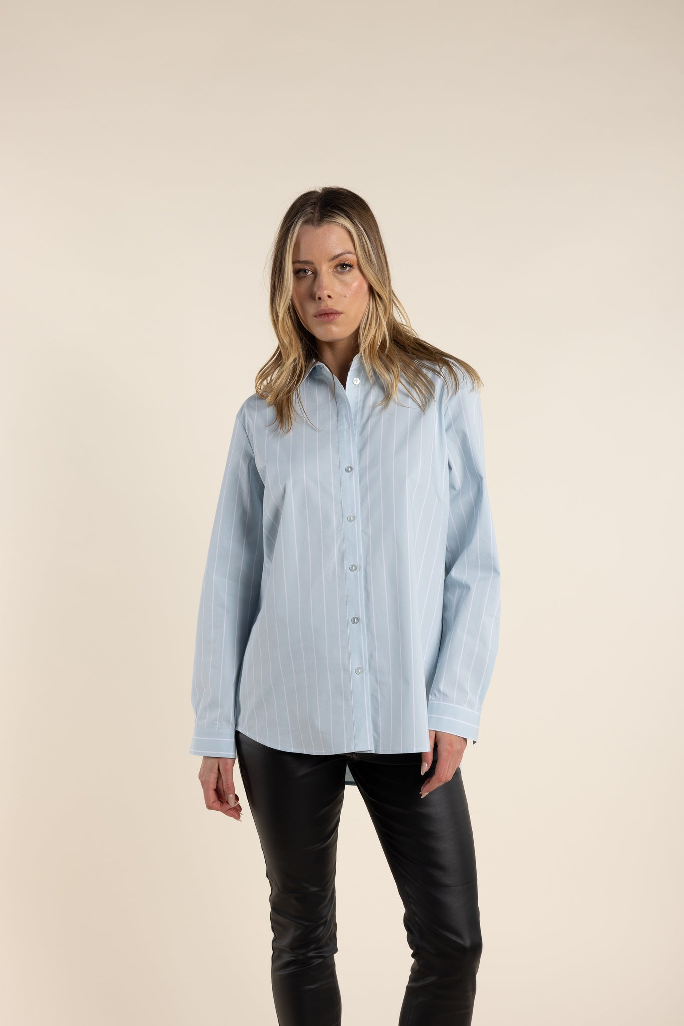 Two-T's Stripe Shirt is an oversized long sleeve shirt in a pretty ice blue and white stripe. So easy to wear in so many ways. Effortlessly stylish, this oversized shirt is a versatile addition to your wardrobe. The pale blue and white stripes add a touch of femininity to any outfit, making it perfect for any occasion. With endless styling options, this shirt will quickly become a favorite go-to piece in your wardrobe.