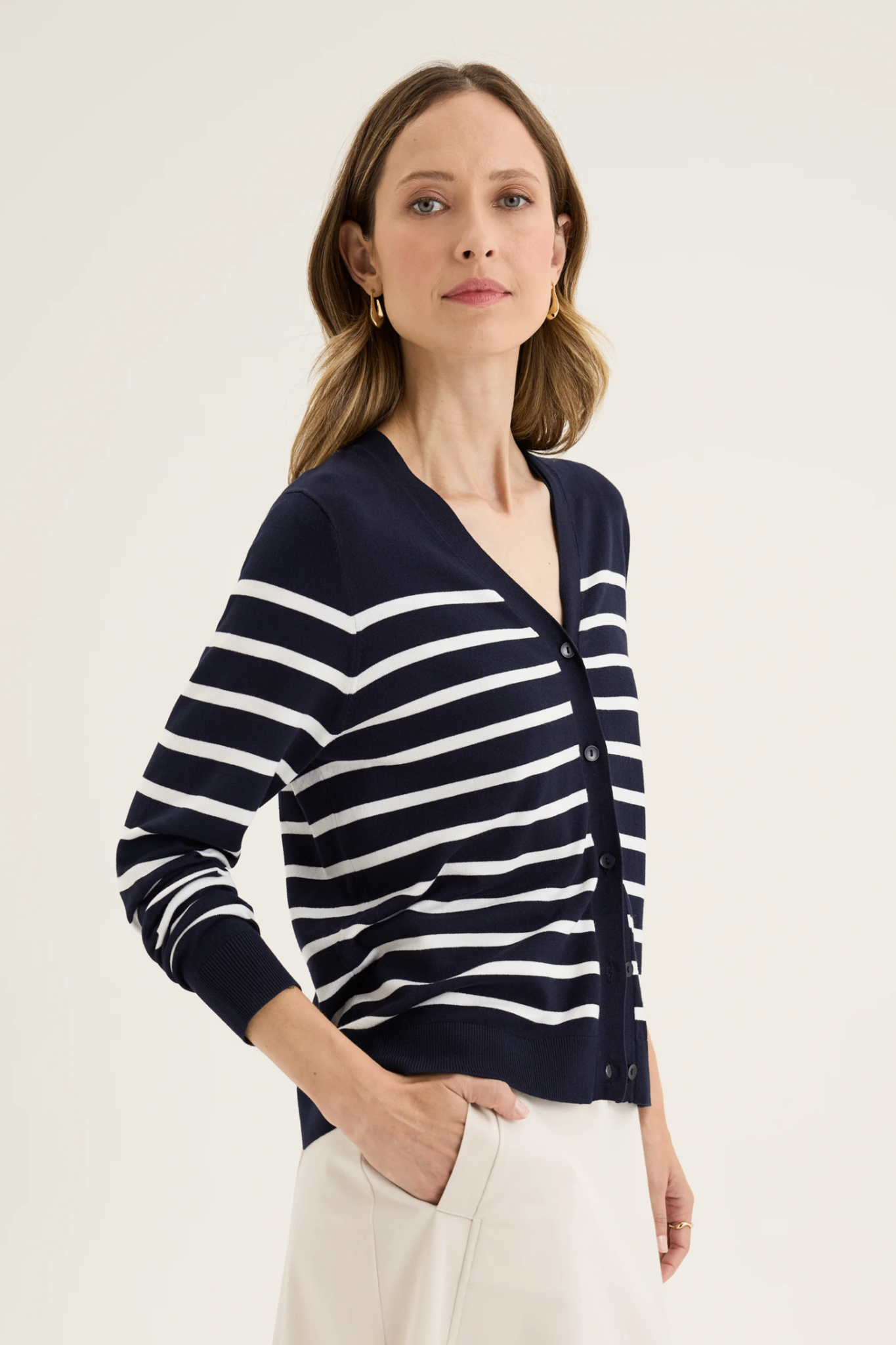 Add an effortlessly polished layer to your look with the Yarra Trail Accession Cardi in Navy and White. Featuring a flattering V neckline and contrast knitted stripes, this button-through style is finished with long sleeves and a relaxed fit for easy, everyday comfort. Made from a soft blend of viscose and nylon, it’s the perfect light layer for in-between seasons.