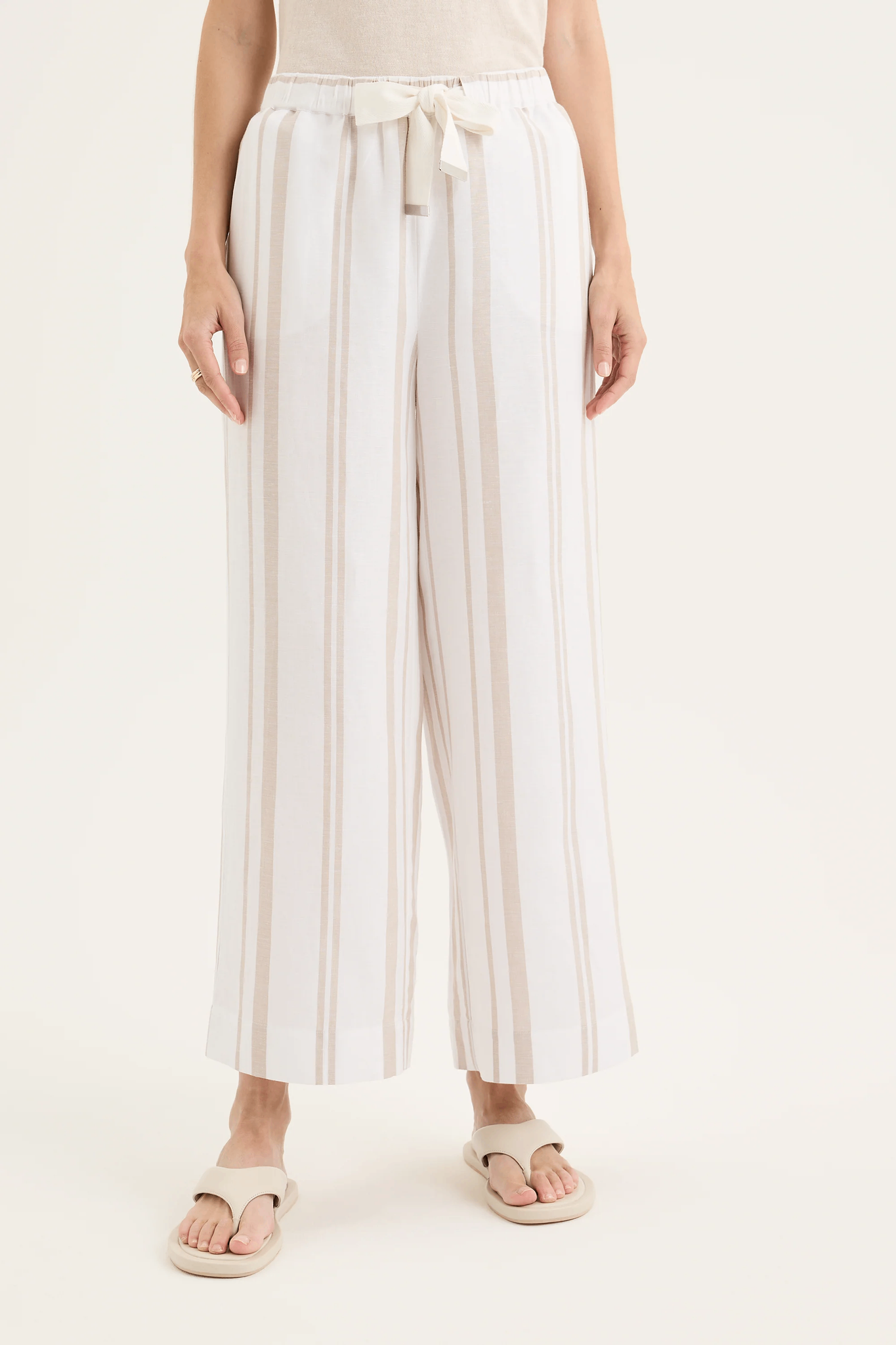 The Yarra Trail Byron Pant in White/Twine is your go-to piece for effortless summer style. Made from airy linen with subtle cream yarn-dyed stripes, it delivers both comfort and timeless appeal. The cropped 7/8 wide-leg silhouette offers an easy, breezy fit, while the elastic waistband with a herringbone tie ensures comfort and a touch of detail. Finished with practical inseam pockets, this pant is as functional as it is flattering. Pair it with a simple tee for relaxed days or team it with the matching Byron Shirt for a polished, coordinated look.