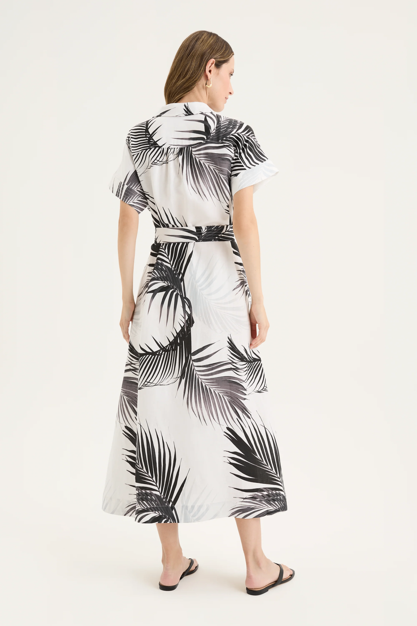 The Yarra Trail Frond Dress offers a fresh take on the classic shirt dress, blending relaxed resort style with modern sophistication. Made from a breathable linen-viscose blend, it features an exclusive leafy frond print that adds a touch of effortless vibrancy. The two-way collar can be styled open for a laid-back feel or turned up for a sharper edge, while the button-through front with topstitch detailing lends a refined finish. Wide-cuffed short sleeves and a softly gathered back yoke create a flattering, easy-to-wear silhouette perfect for warm days.