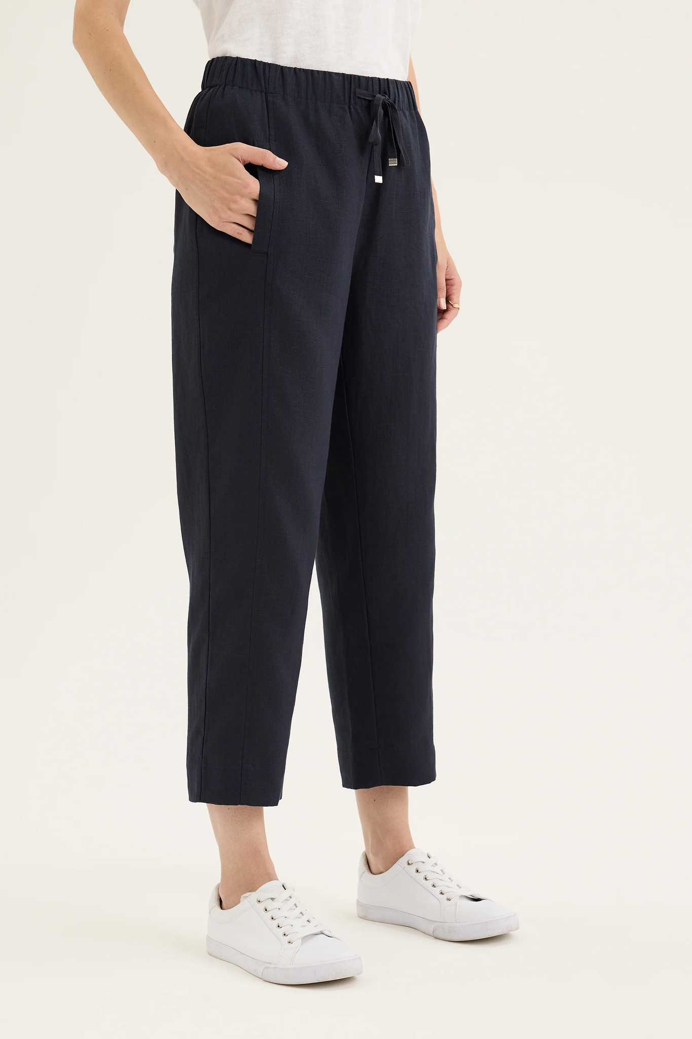 Yarra Trail brings effortless polish to your everyday wardrobe with the Tirari Slim Pant in classic Navy. Made from 100% linen, this 7/8 length pant features a slim silhouette that flatters without compromising on comfort. The elasticated waistband with herringbone tie adds a casual touch, while front design panels and functional welt pockets create a clean, modern finish. Back patch pockets complete the look, making this an easy go-to for laid-back days or smart-casual moments.