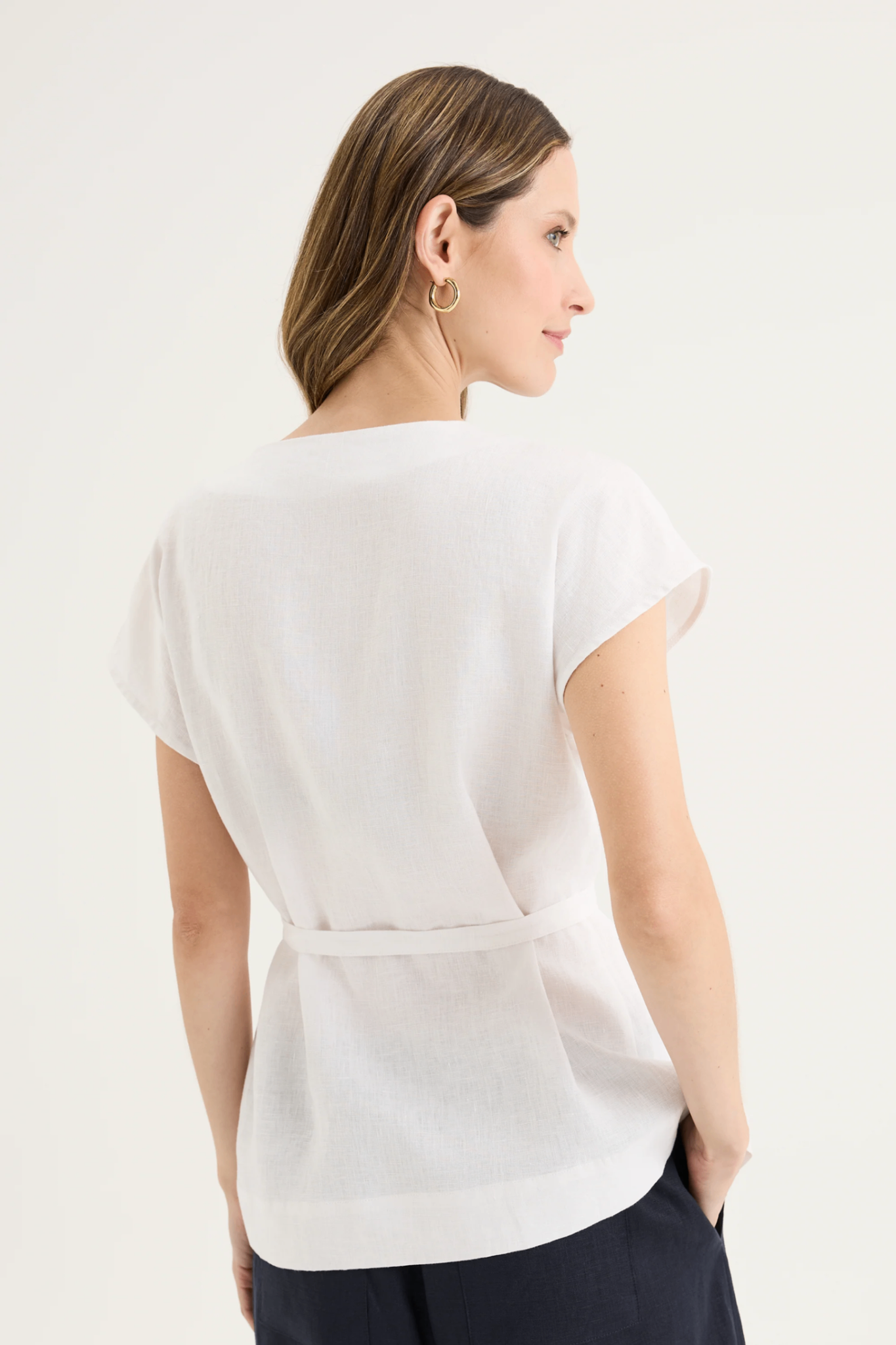 The Tirari Wrap Top brings easy elegance to everyday linen dressing. Crafted from 100% linen in Yarra Trail’s signature Tirari weave, it offers a breathable, softly textured feel that only gets better with wear. The wrap design ties neatly at the waist through side loops, creating a flattering shape with all-day comfort. Featuring extended cap sleeves and a clean V-neckline, this semi-fitted top blends structure and softness in perfect balance. Pair it with wide-leg linen pants for a refined summer look or with denim for relaxed sophistication — a true wardrobe essential that feels effortlessly put together.
